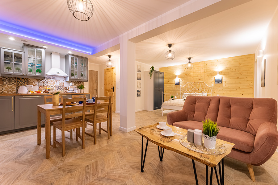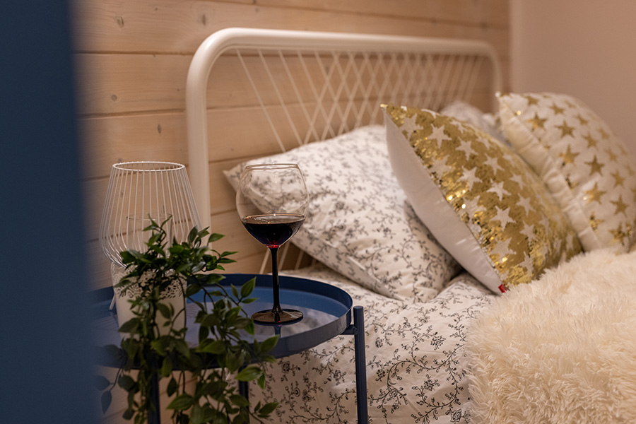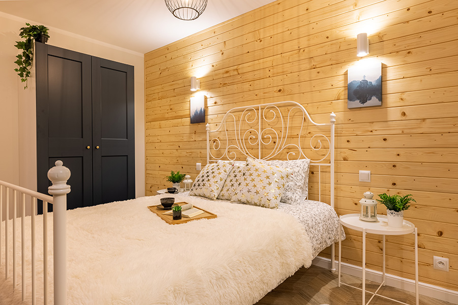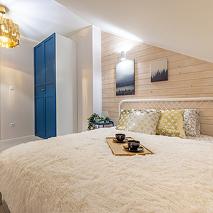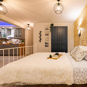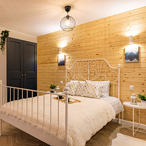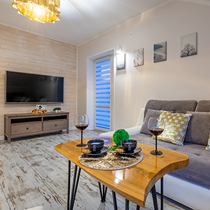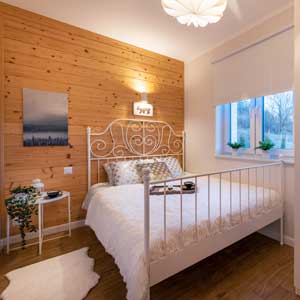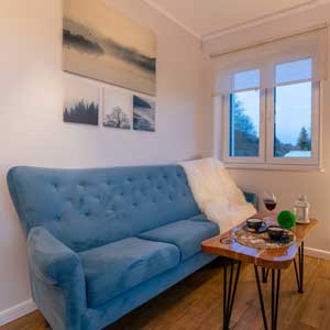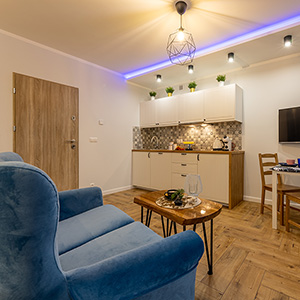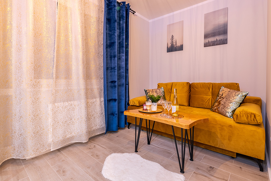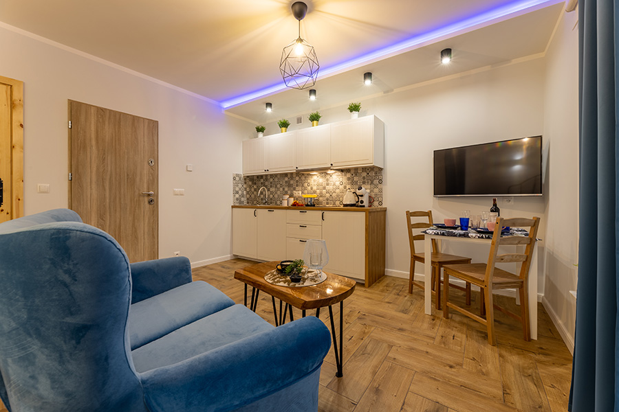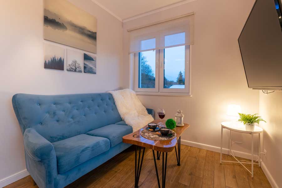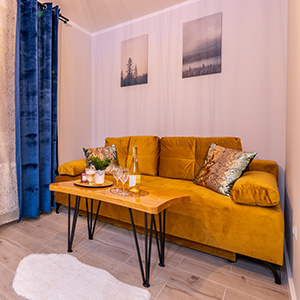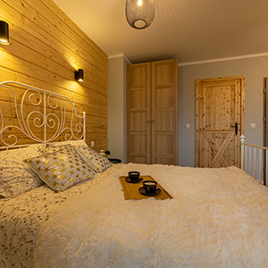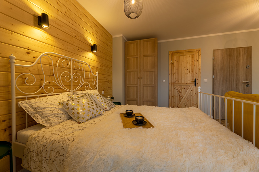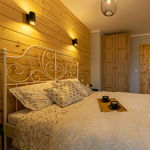 2-osobowy z łożem małżeńskim, z miejscem do odpczynku, prywatną łazienką i tarasem. Aneks kuchenny z ekspresem do kawy i pełnym wyposażeniem.