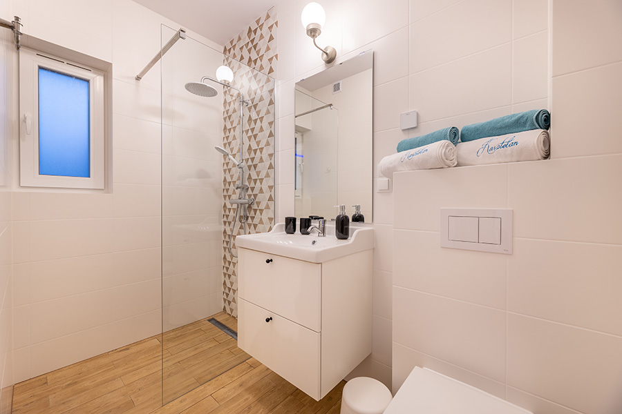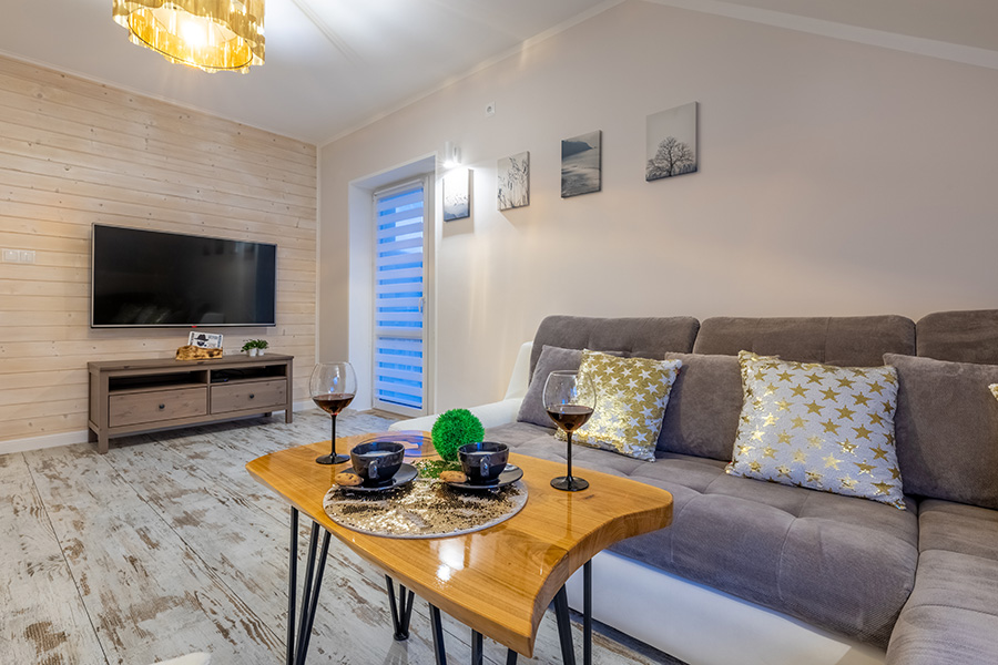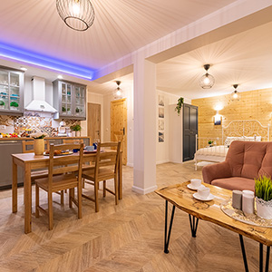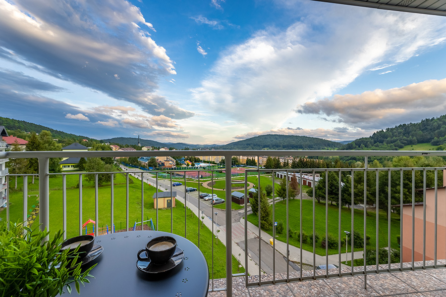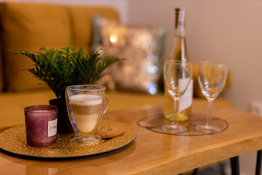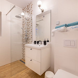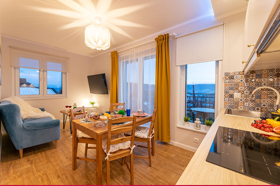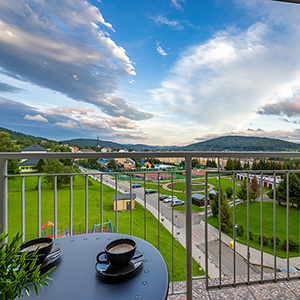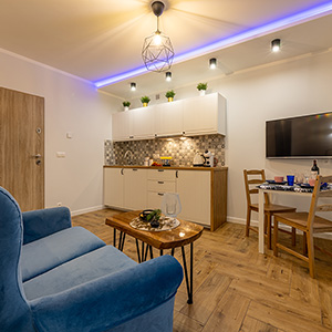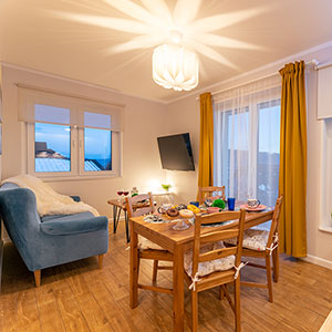 4-osobowy z dwoma sypialniami, w każdym łoże małżeńskie oraz salon z aneksem kuchennym, ekspresem do kawy i pełnym wyposażeniem. Prywatną łazienką i przestronnym balkonem.