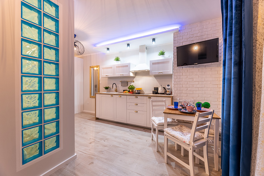 4-osobowy z salonem, z aneksem kuchennym z pełnym wyposażeniem, z ekspresem do kawy. Sypialnia z łożem małżeńskim, prywatna łazienka z prysznicem.