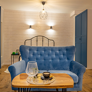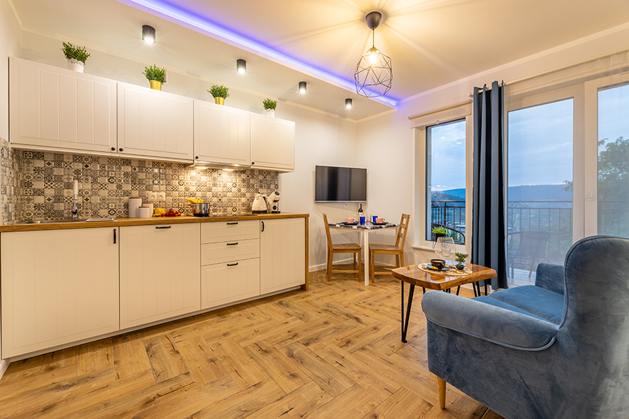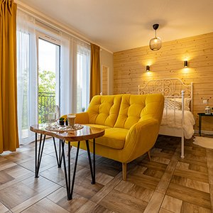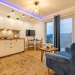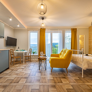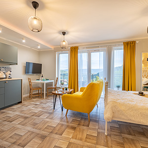 2-osobowy z łożem małżeńskim, z miejscem do odpczynku, prywatną łazienką i przestronnym balkonem. Aneks kuchenny z ekspresem do kawy i pełnym wyposażeniem.